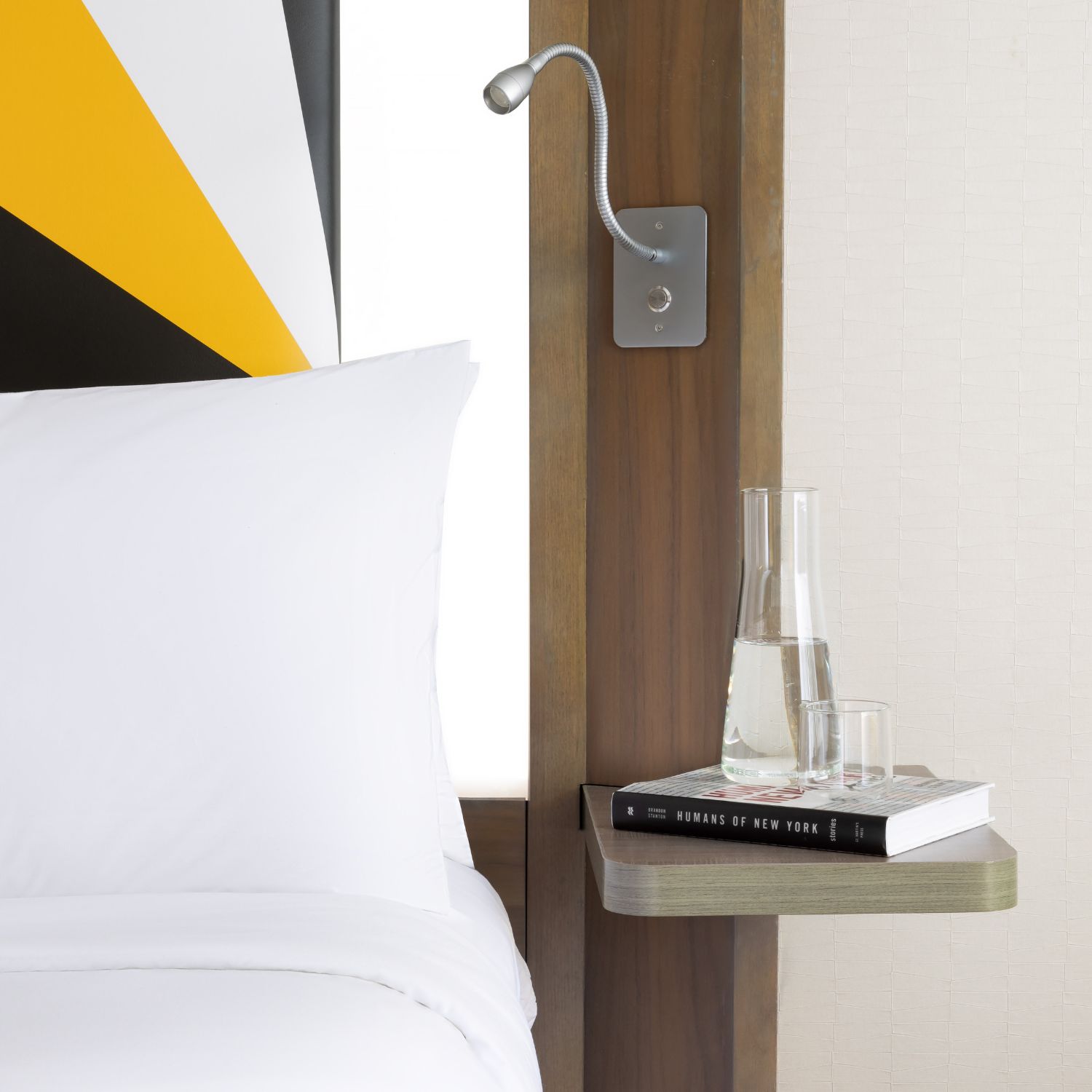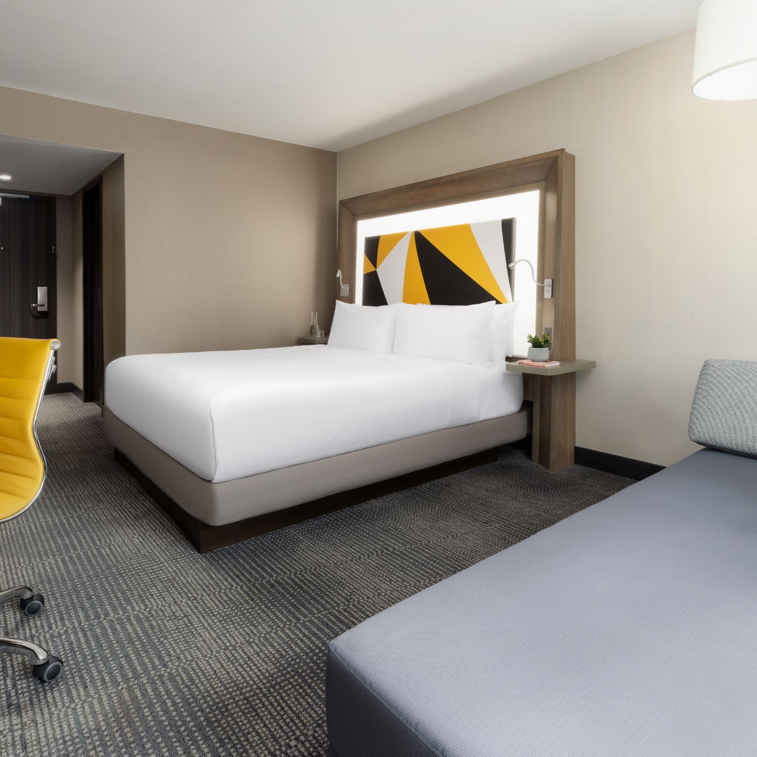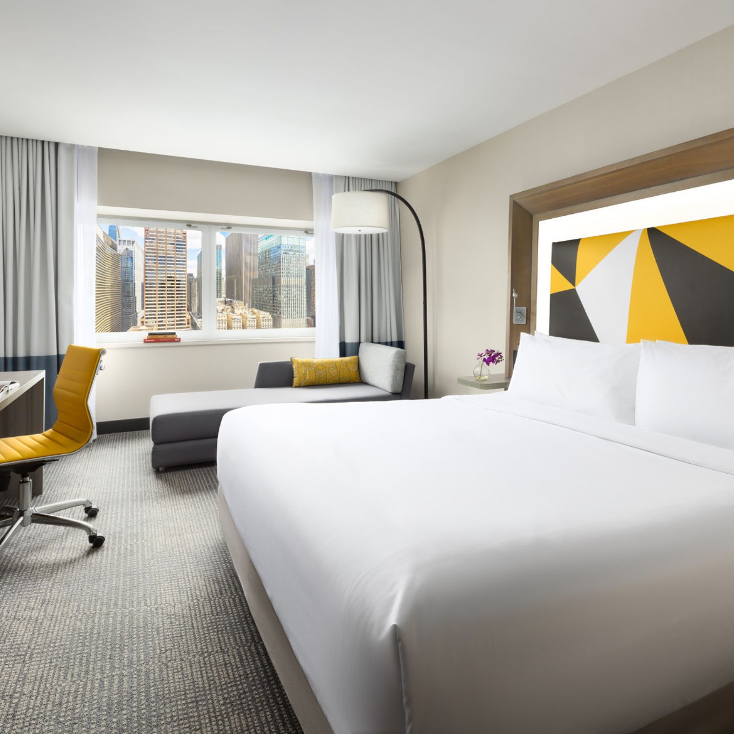 Reenergize and stay productive in a refreshing space with your very own city or Hudson River view. 280 square feet allows you to stretch out, while plenty of dresser and closet space make it easy to settle in. The light-up headboard on the king bed and a chaise lounge chair keeps things comfy in the bedroom and the rain shower beckons in the bathroom. Charge your devices with eight sets of outlets and bask in the quiet vibe, insulated by soundproof glass. It’s all topped off by a mini fridge for storing food and drinks.