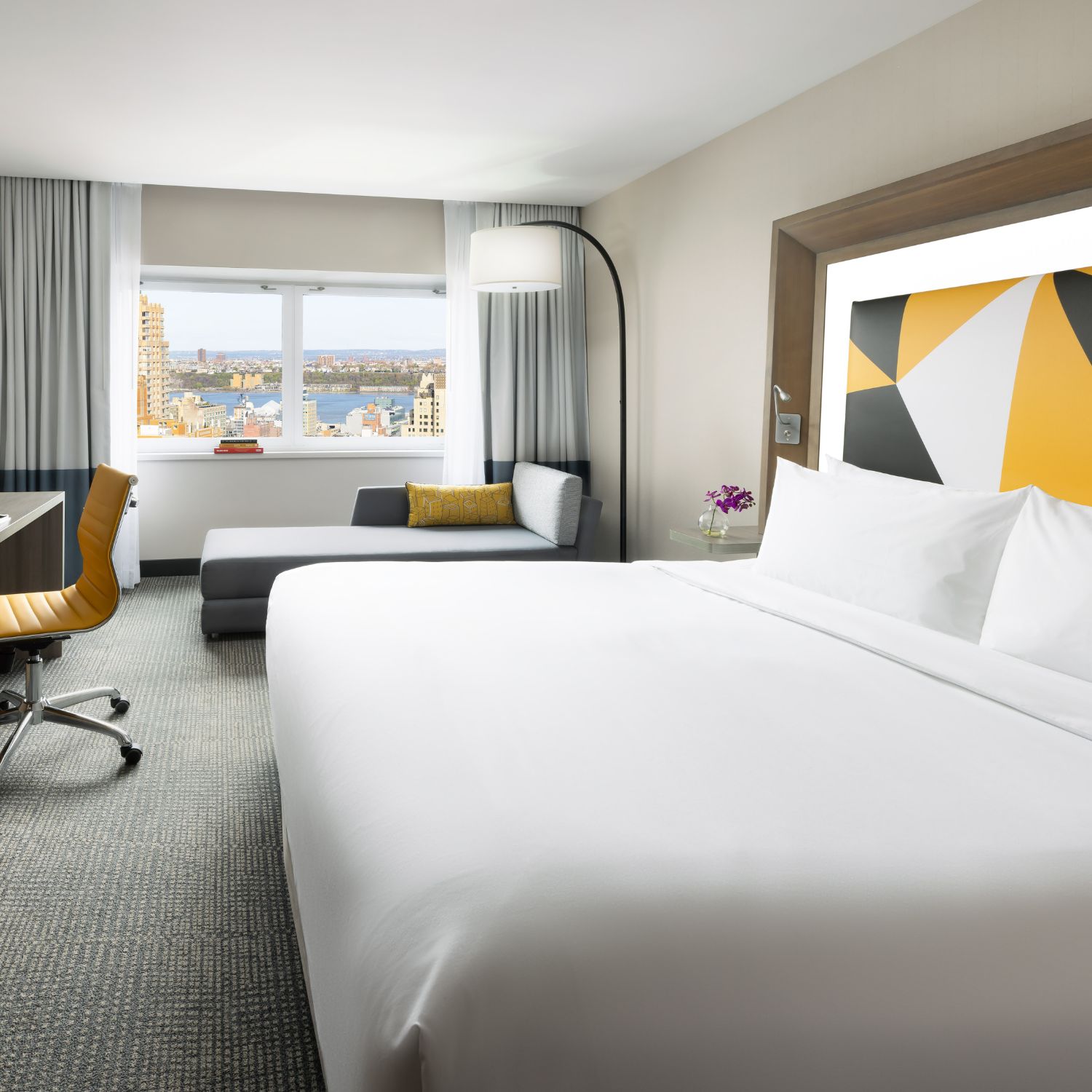 Located on a higher floor with stunning view of Hudson river. Enjoy a comfortable stay in our modern yet charming room designed to meet all your needs. Elevate your stay on a higher floor, as you look out over the River. Our Superior rooms offer unparalleled comfort, spectacular city views and special touches that make all the difference. The 280-square-foot space houses a King or a Double/Double bed with light-up headboard and a chaise lounge, in King bedded rooms, along with plenty of closet and dresser space. Relax, leave the hassle and bustle of the city streets below, get some work done, and take full advantage of your stay.