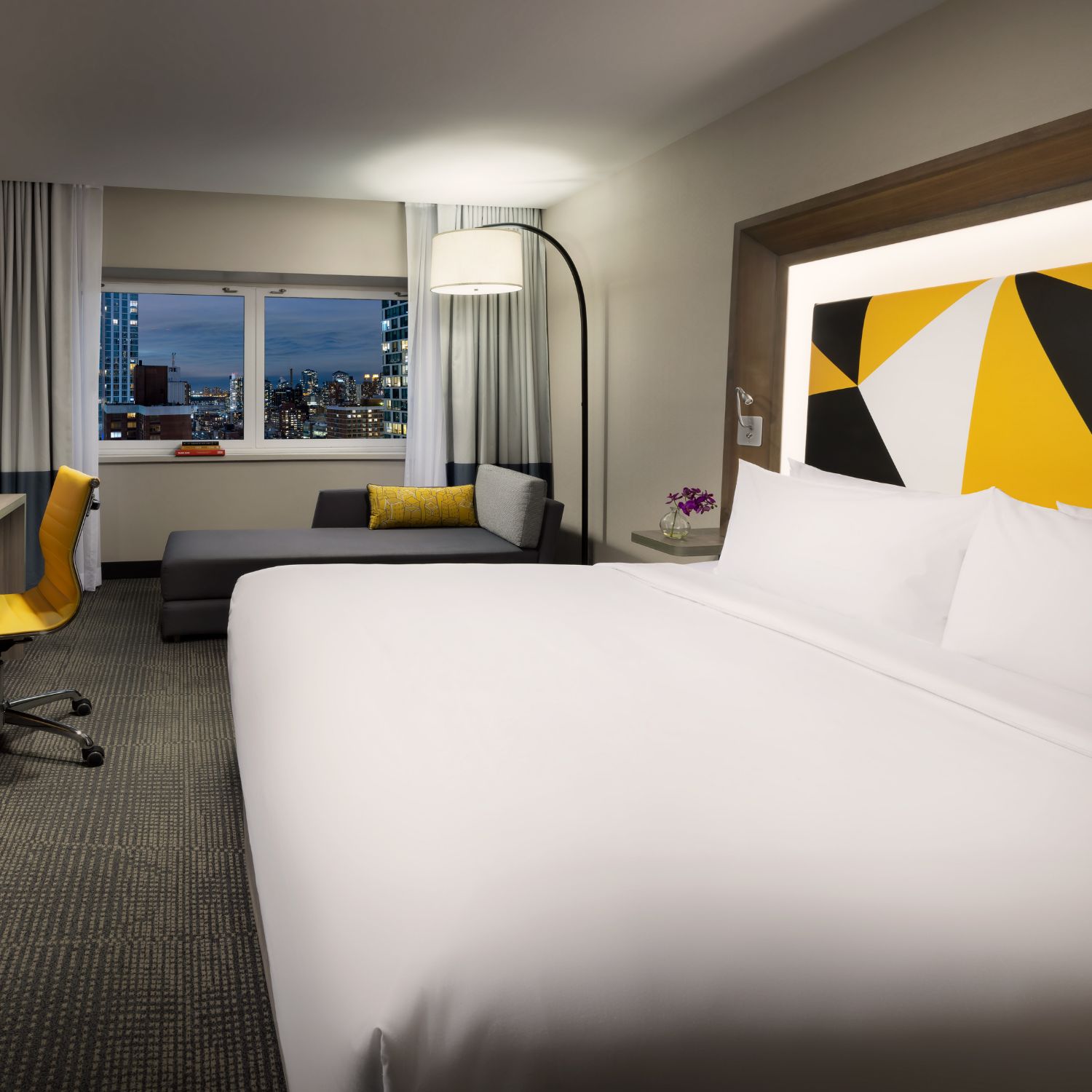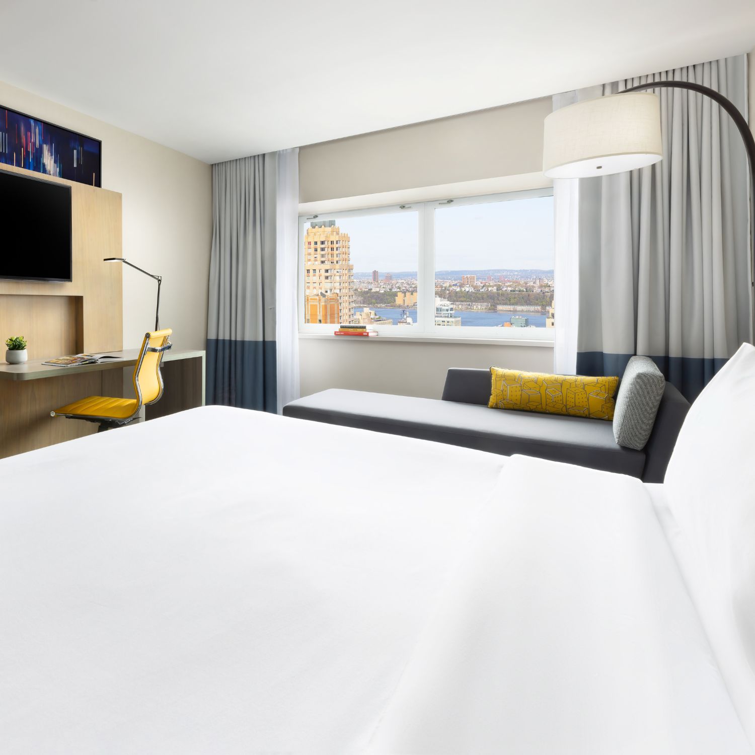 Located on a higher floor with stunning view of Hudson river. Enjoy a comfortable stay in our modern yet charming room designed to meet all your needs. Elevate your stay on a higher floor, as you look out over the River. Our Superior rooms offer unparalleled comfort, spectacular city views and special touches that make all the difference. The 280-square-foot space houses a King or a Double/Double bed with light-up headboard and a chaise lounge, in King bedded rooms, along with plenty of closet and dresser space. Relax, leave the hassle and bustle of the city streets below, get some work done, and take full advantage of your stay.